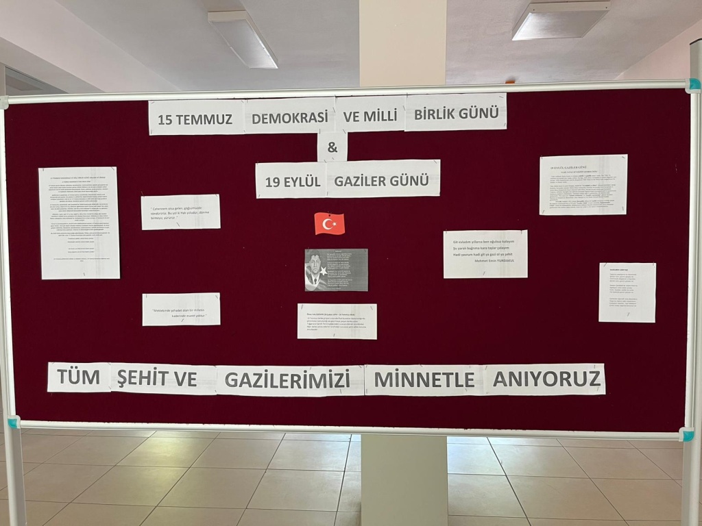 Vatan sevgisinin sembolü olan gazilerimizin 19 Eylül Gaziler Gününü ve 15 Temmuz Milletin Zaferini anmak için okulumuzda çeşitli etkinlikler düzenlendi. Bir grup öğrencimiz beden eğitimi öğretmenimiz rehberliğinde gaziler yürüyüşüne katılım sağladı.Öğrencilerimiz günün anlam ve önemine ilişkin farkındalık yaratacak panolar hazırladı.Okul programınin yanı sıra mescidimizde bu vatan için yaralanan tüm gazilerimizin ve canlarını hiç düşünmeden feda eden şehitlerimizin ruhlarına Kur'an-ı Kerim okundu ve dualar edildi.Üsküdar Borsa İstanbul kız Mesleki ve Teknik Anadolu Lisesi olarak şehit ve gazilerimizi saygı, rahmet ve şükranla anmamızın , onlara gereken saygıyı her zaman ve her yerde göstermemizin gereği ve önemi vurgulanmıştır. Şehitlerimizi ve gazilerimizi şükranla anıyor; çalışmada görev alan öğretmen ve öğrencilerimizi tebrik ediyoruz